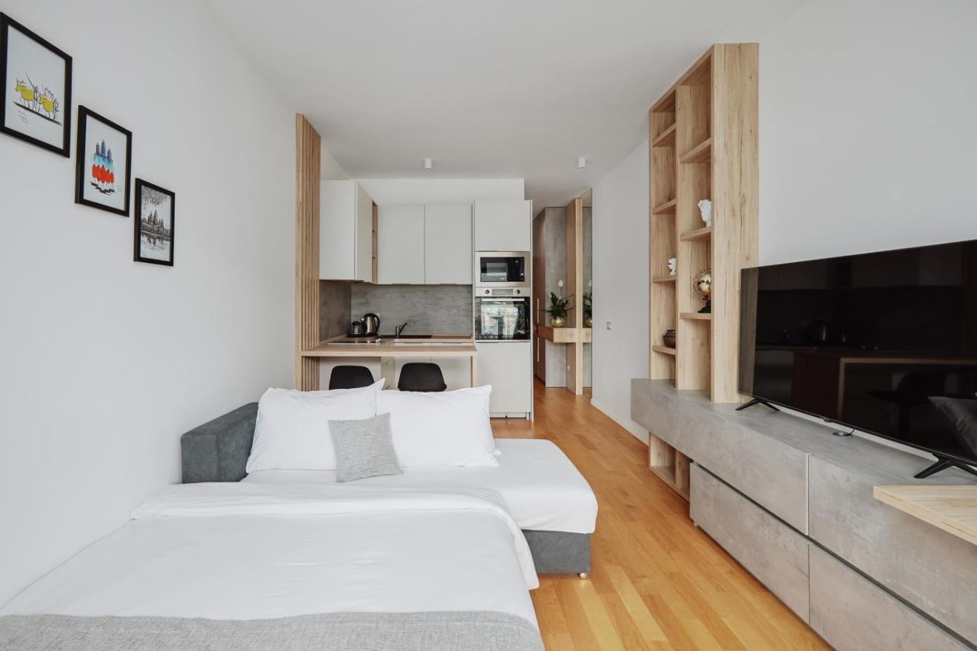 Studio Apartment. Boasting a private entrance, this air-conditioned apartment features 1 living room, 1 separate bedroom and 1 bathroom with a walk-in shower and a hairdryer. The well-fitted kitchen has a stovetop, a refrigerator, a dishwasher and kitchenware. Featuring a balcony with sea views, this apartment also features a washing machine and a flat-screen TV with cable channels. The unit has 1 bed.