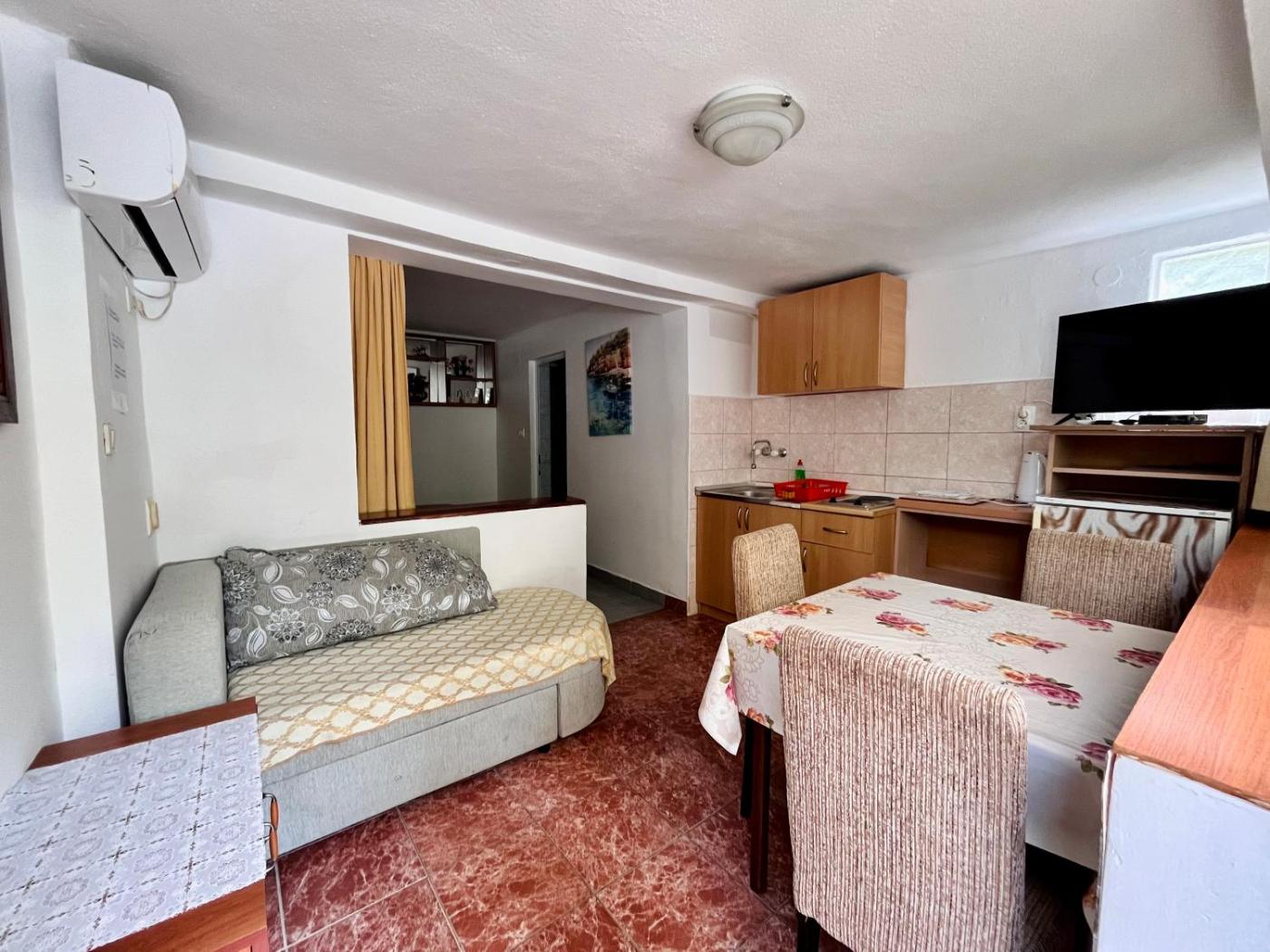 One-Bedroom Apartment with Sofa Bed. Featuring a private entrance, this air-conditioned apartment consists of 1 living room, 1 separate bedroom and 1 bathroom with a bath or a shower and a hairdryer. Guests can make meals in the kitchen that is equipped with a stovetop, a refrigerator, kitchenware and an electric kettle. Boasting a balcony, this apartment also provides a seating area, a dining area and a TV with cable channels. The unit offers 3 beds. ;