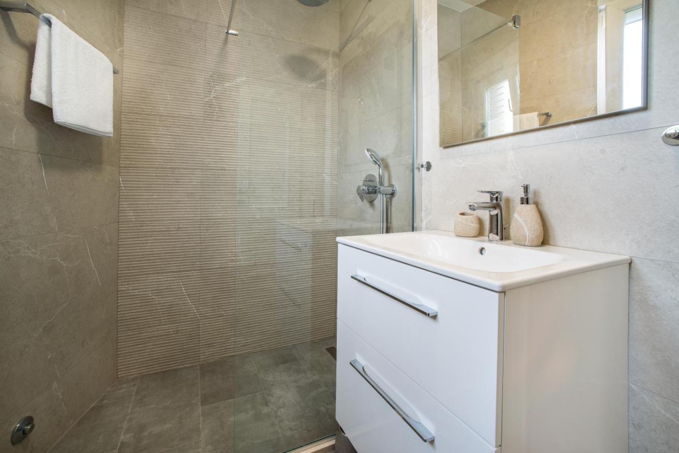 Two-Bedroom Apartment with Balcony and Terrace. This spacious apartment includes 1 living room, 2 separate bedrooms and 2 bathrooms with a walk-in shower and free toiletries. In the well-fitted kitchen, guests will find a stovetop, a refrigerator, a dishwasher and kitchenware. The air-conditioned apartment offers a flat-screen TV with satellite channels, a washing machine, a private entrance, a tea and coffee maker as well as sea views. The unit has 2 beds. ;