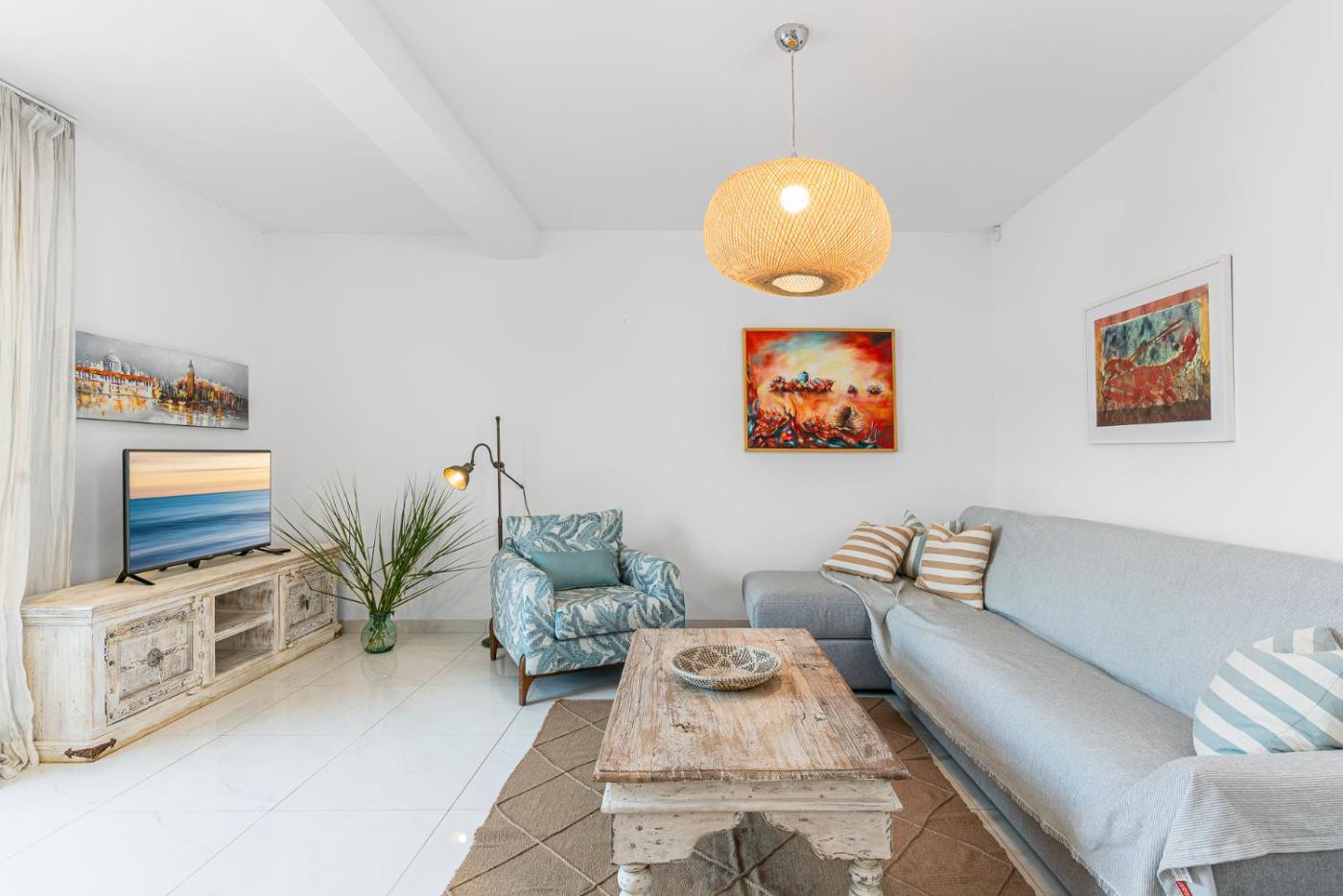 Villa. Featuring a private entrance, this air-conditioned villa comprises 1 living room, 2 separate bedrooms and 3 bathrooms with a walk-in shower and a hairdryer. Meals can be prepared in the well-fitted kitchen, which comes with a stovetop, a refrigerator, a dishwasher and kitchenware. Boasting a terrace with sea views, this villa also provides a washing machine and a flat-screen TV with cable channels. The unit offers 4 beds.